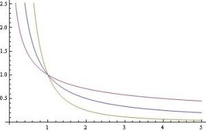 (in yellow, blue and red respectively). Hence the if we find the area under these curves between any two points bigger than 1, the area under a ‘smaller’ function will be smaller than the area under a ‘bigger’ one.